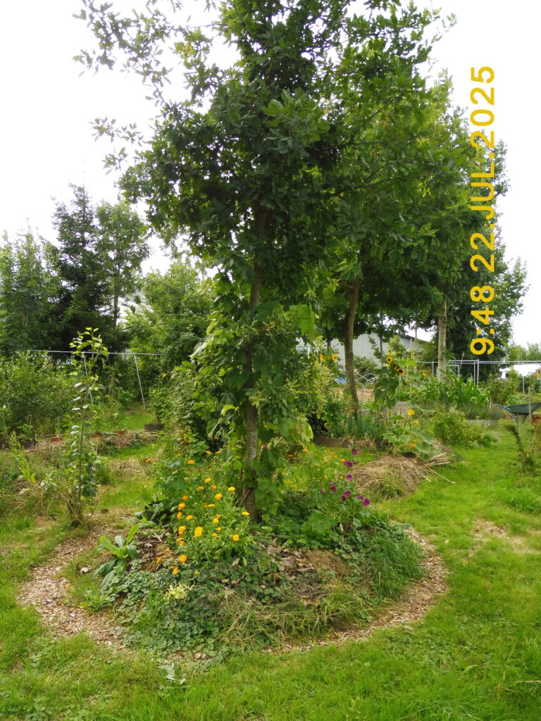Ein entscheidendes Merkmal dieses Systems: Die Baumscheibe wächst mit dem Baum mit. Je größer die Baumkrone wird, desto weiter darf – und sollte – sich auch die bepflanzte Fläche ausdehnen. Das erlaubt es, neue Kulturen, z.B. Beerensträucher, schrittweise zu integrieren. So bleibt die Fläche stets dynamisch und im Wandel – ganz im Sinne der natürlichen Entwicklungsstufen von blankem Boden zum Wald.