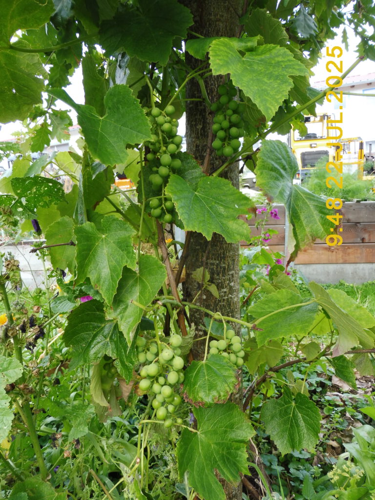 Eine besonders spannende Ergänzung zum Baum ist eine Kletterpflanze, die auch wieder einen Ertrag bringt. In meinem Garten stehen vier Eichen. Um eine Eiche habe ich eine Baumscheibe angelegt, auf der verschiedene blühende Pflanzen für Tees, sowie einige Gemüsepflanzen wachsen. Direkt am Stamm wächst ein Weinstock und nutzt als Kletterpflanze den Baum als Rankhilfe. Das erhöht die Vielfalt im Garten und auch den Ertrag pro Fläche. In diese Kombination wird die Vertikale als weitere Dimension des Wachstums hinzugefügt.